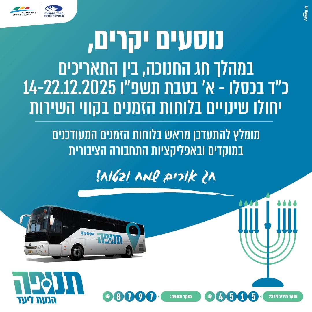 חדשות נוסעים יקרים במהלך חג החנוכה בין התאריכים 14-22/12/2025 יחולו שינויים בלוחות הזמנים בקווי השירות לצפות